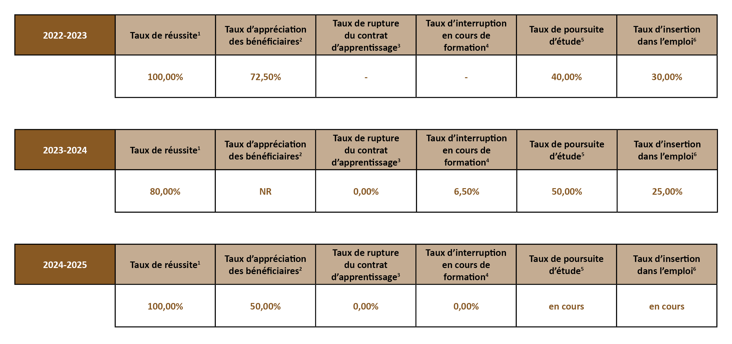 2. Le taux d'appréciation des bénéficiaires prend en compte l'appréciation générale de la formation suivie. Il se base sur une enquête passée auprès des apprenants à la fin de leur formation. L'enquête pose des questions sur la satisfaction des équipements techniques et sportifs mis à disposition, de l'hébergement, de la restauration et du réseau internet.