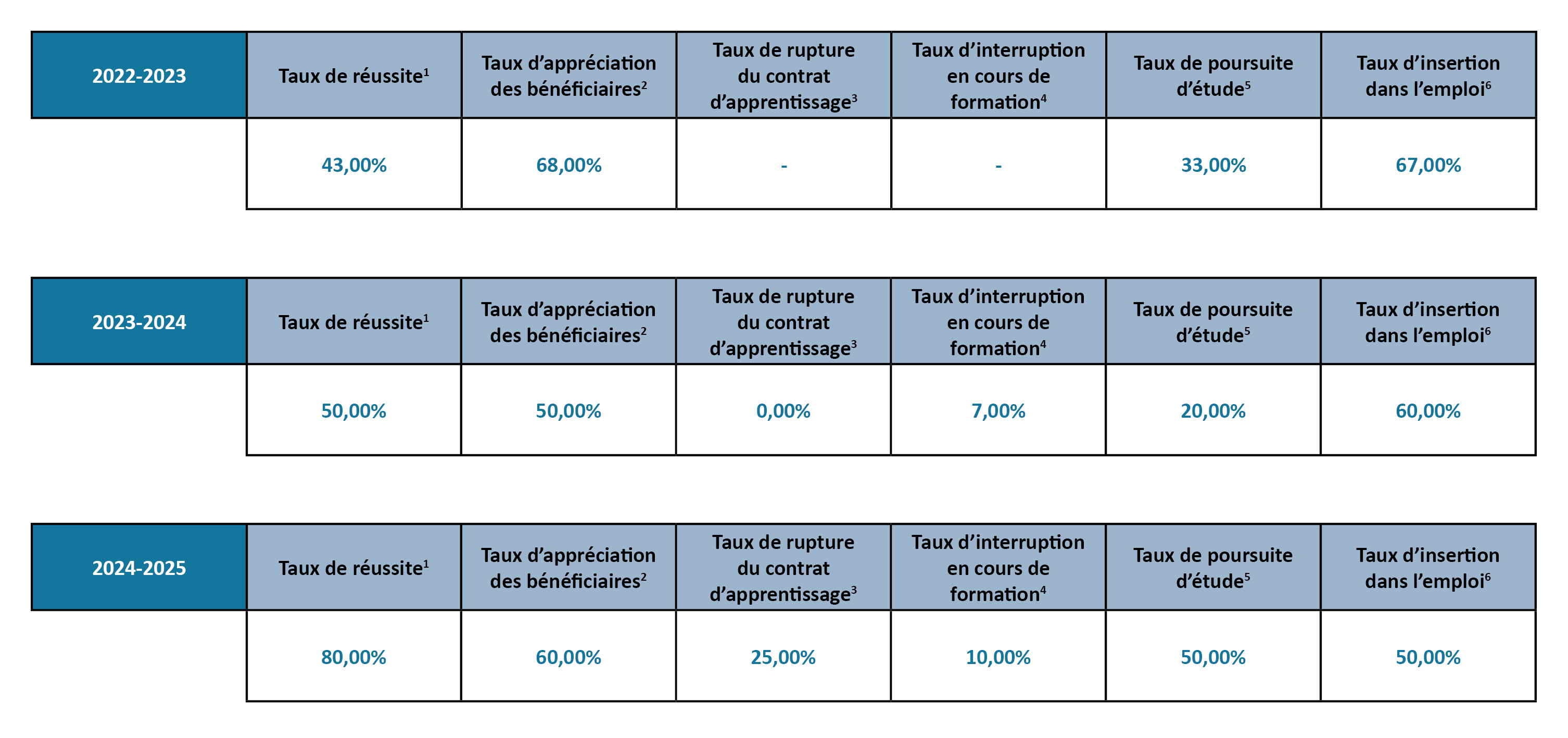 3. Le taux de rupture en cours de formation s'entend lorsqu'aucune solution n'aura permis à l'apprenant de poursuivre soit en apprentissage soit par la voie scolaire dans sa filière de départ ou réorienter.