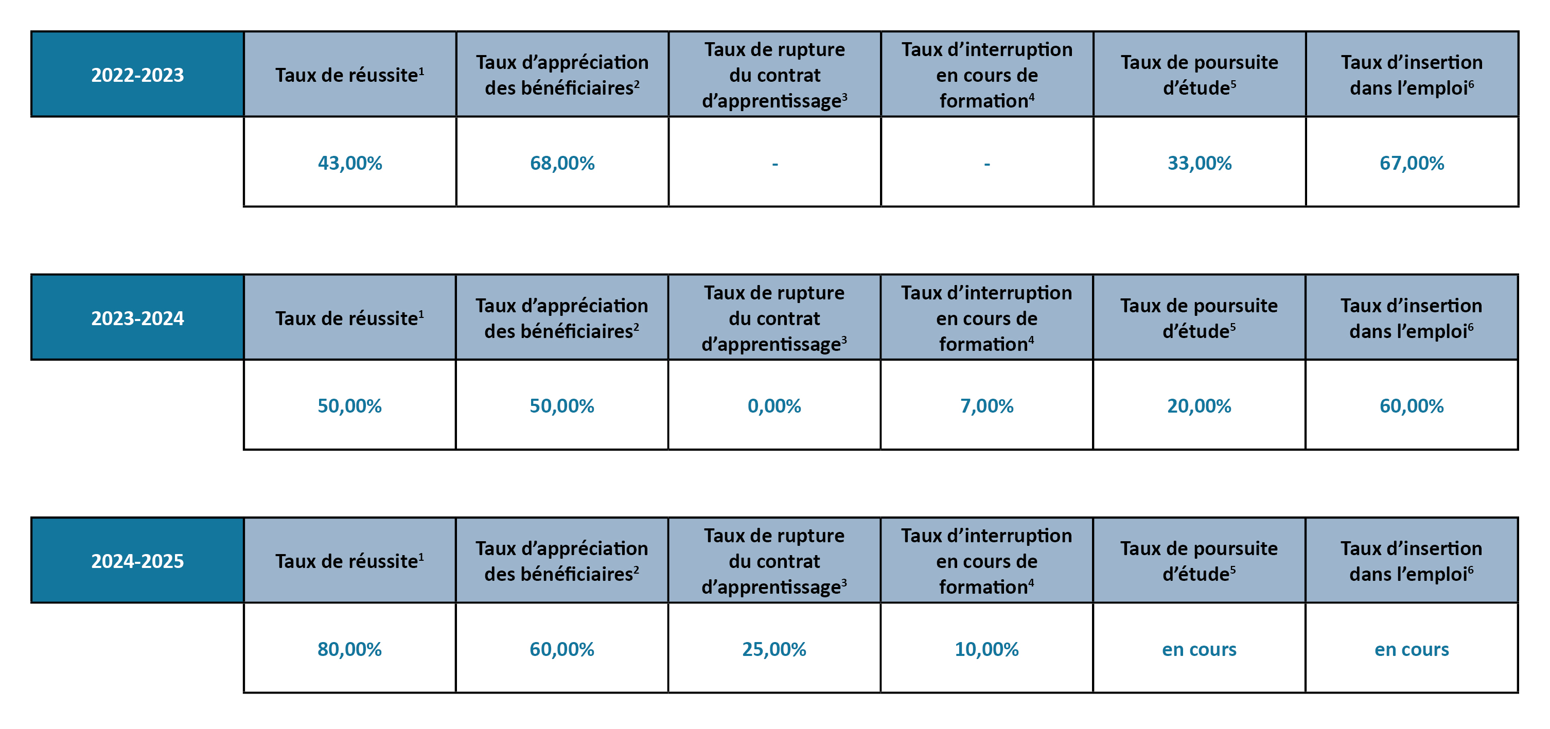 2. Le taux d'appréciation des bénéficiaires prend en compte l'appréciation générale de la formation suivie. Il se base sur une enquête passée auprès des apprenants à la fin de leur formation. L'enquête pose des questions sur la satisfaction des équipements techniques et sportifs mis à disposition, de l'hébergement, de la restauration et du réseau internet.